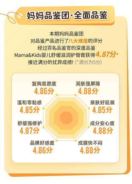 此次品鉴活动,Mama&Kids婴儿舒缓滋润护臀膏斩获4.87分的好成绩,足以证明其“外防护+内修护的护臀”实力。未来,期待Mama&Kids继续深耕母婴人群、敏感肌人群护肤领域,不断创新,带来更贴心、更安心、更专业的护理产品,守护母婴人群肌肤健康。