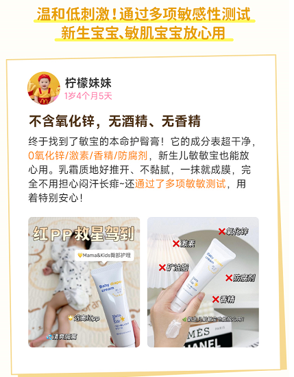 配方还十分温和,11大0添加,无酒精/激素/香精/防腐剂的加入,并且通过多项敏感性测试,安心到私处都能用!浏览妈妈们的品鉴报告,有关产品温和安心的闪光点被频频提及——“成分很温和”“我家娃是敏敏肌也没半点刺激”“没有什么香精气味,给宝宝涂很放心”……